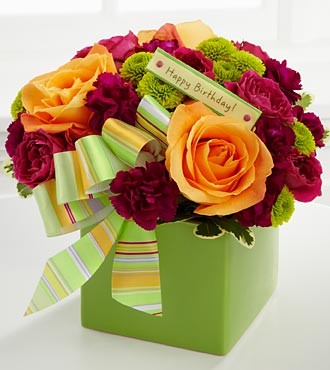 The Birthday Bouquet is an expression of warm sentiments and fantastic fortune for the year to come! Orange roses, fuchsia spray roses, plum miniature carnations and green button poms are beautifully arranged in a designer green ceramic and accented with a decorative ribbon to create the perfect way to wish them well on their big day. Substitutions maybe required and no pick provided. Deluxe is shown