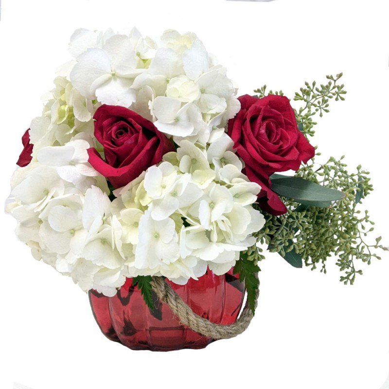 These gorgeous hydrangea blooms with stunning pops of red roses are expertly designed to create the perfect arrangement. Lovers rejoice, this beauty has your name written all over it! **Deluxe size is shown