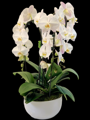 Three beautiful white phalaenopsis orchids planted together in a white ceramic bowl for an elegant presentation. (please note pot colour may vary)