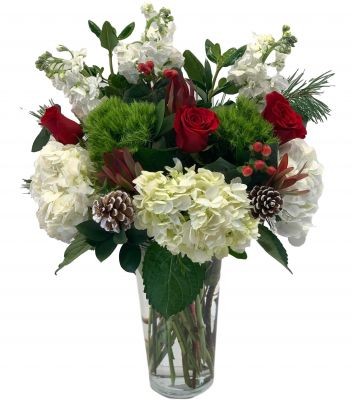 This winter vase arrangement features hydrangea, roses, berries, pinecones, winter greens and more! Deluxe Size is shown.